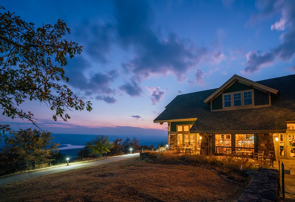 Each of the Lodge’s 60 guest rooms offer an incredible view of Petit Jean River Valley and Blue Mountain Lake. At 2,753 feet, don’t be surprised if a wistful cloud passes by. There is a 1,325-square-foot indoor swimming pool with children’s area, lap lane and a hot tub. The Fitness Center is close by. The Skycrest Restaurant serves Southern style fare and is open daily.