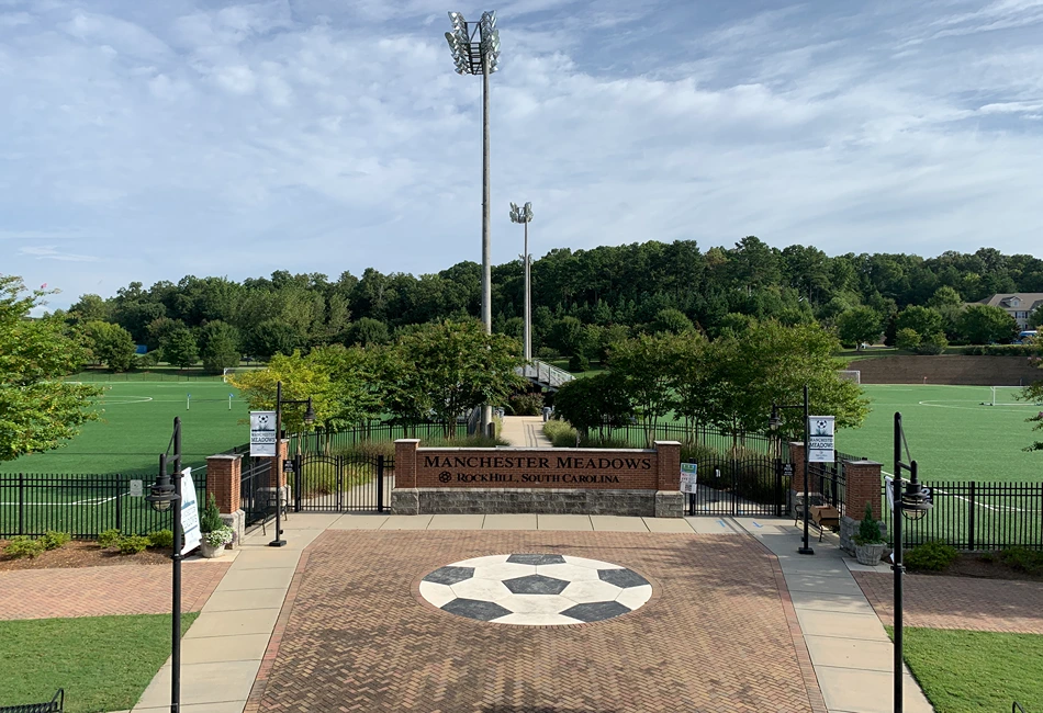 Manchester Meadows is a 70-acre outdoor sports complex designed to host regional and national tournaments. It features six natural grass fields plus two synthetic turf stadium fields, each with 750-seat stadium-style seating and electronic scoreboards. A 9,000-square-foot, two-story pavilion houses concessions, restrooms, meeting rooms, and park offices. The complex also includes walking and biking trails, including a 1.1-mile outer loop, playgrounds, a lake pavilion with seating for nearly 300, and multiple picnic shelters.