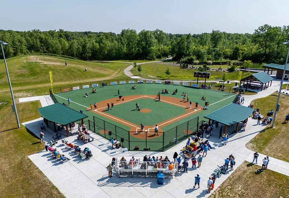 Mundy Miracle Commons is the largest municipally owned and operated ADA/universal design park in Michigan. It features a barrier-free Miracle League ballfield, more than two miles of 10-foot-wide paved paths, ADA bathrooms, a concessions space, and public pavilions.